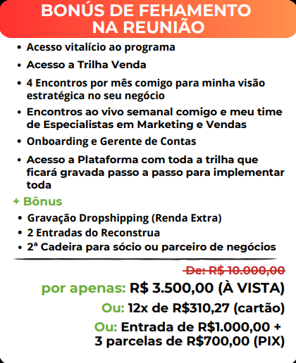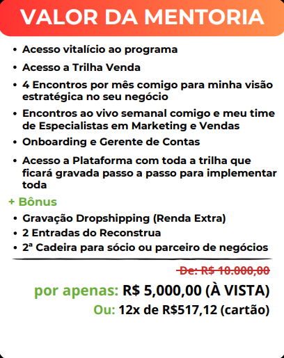 Essa mentoria é um compromisso com a sua virada profissional! Aqui você vai aprender a vender de forma constante, se posicionar como autoridade e criar estratégias reais de geração de renda.